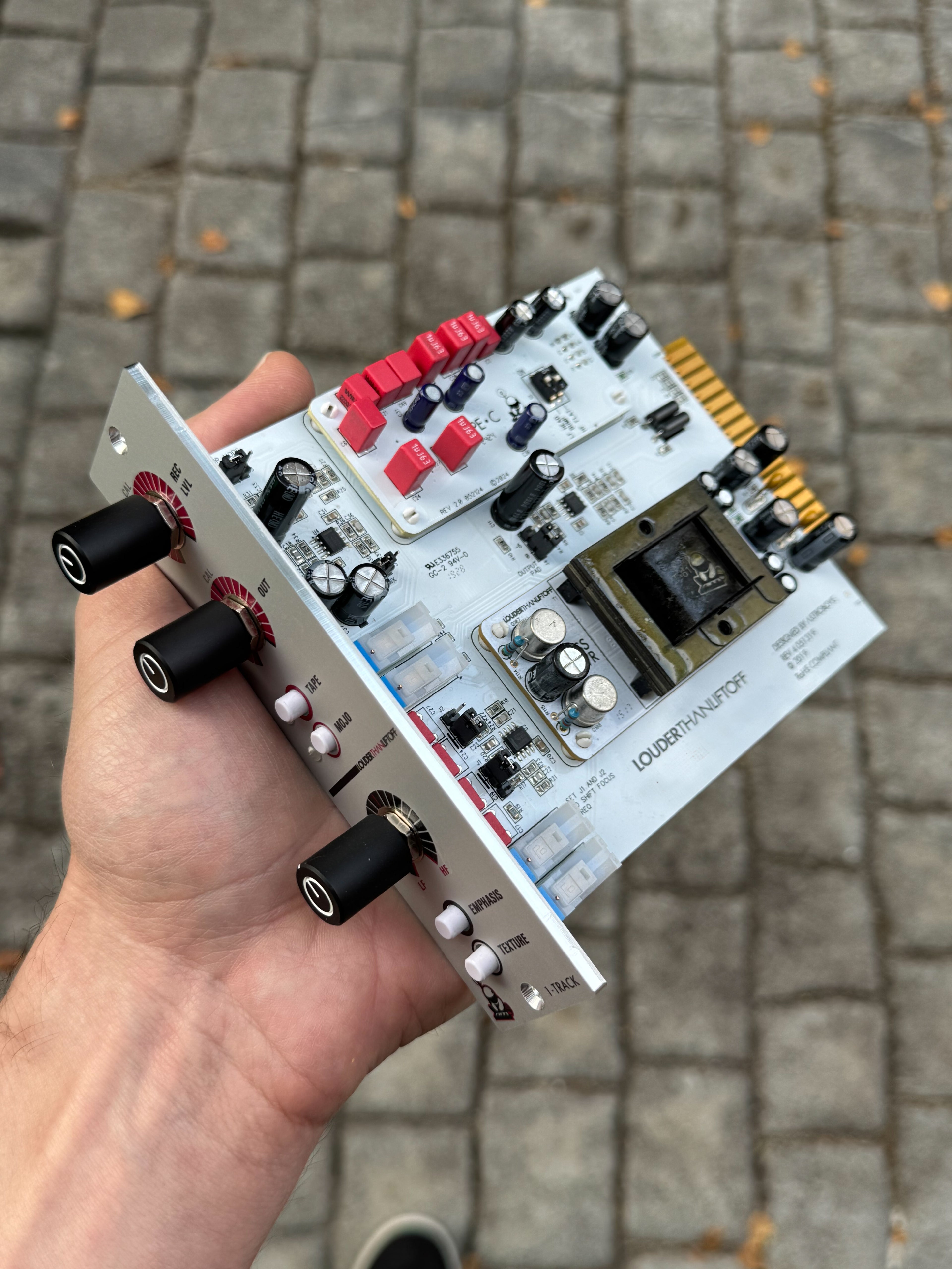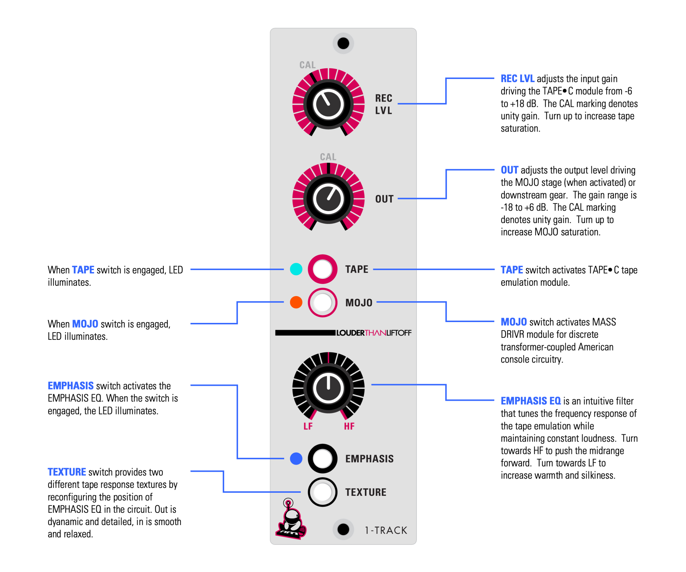 1-TRACK ist ein Modul der 500er-Serie, das analoge Bandemulation und diskrete, transformatorgekoppelte Mojo-Schaltung kombiniert und so ein Klangerlebnis schafft, das an die Zeit erinnert, als riesige Kassettendecks und Aufnahmekonsolen das Sagen hatten. Anders als andere Hardware- oder Software-Bandemulationen verzichtet dieses auf komplizierte Regler, um schnell brauchbare Ergebnisse zu erzielen. Der Aufnahmepegel steuert die Bandsättigung. Der Ausgangsregler stellt den Pegel ein, der die folgende MOJO-Stufe erreicht. Der EMPHASIS-EQ mit einem Regler kann vor oder nach der Bandemulation platziert werden, um den Klang mühelos vor oder nach dem Band zu formen. Das Signal durchläuft zuletzt eine MOJO-Stufe einer amerikanischen Konsole, die von unserem Mass Drivr-Modul angetrieben wird. Jeder der drei Prozessoren kann einzeln umgangen werden. Ganz im Sinne der gesamten Louder Than Liftoff-Ausrüstung liefert Ihnen 1-TRACK intuitive Ergebnisse, insbesondere wenn es in Ihrer Tracking-Kette vor dem ersten Durchgang der A/D-Wandlung verwendet wird.
