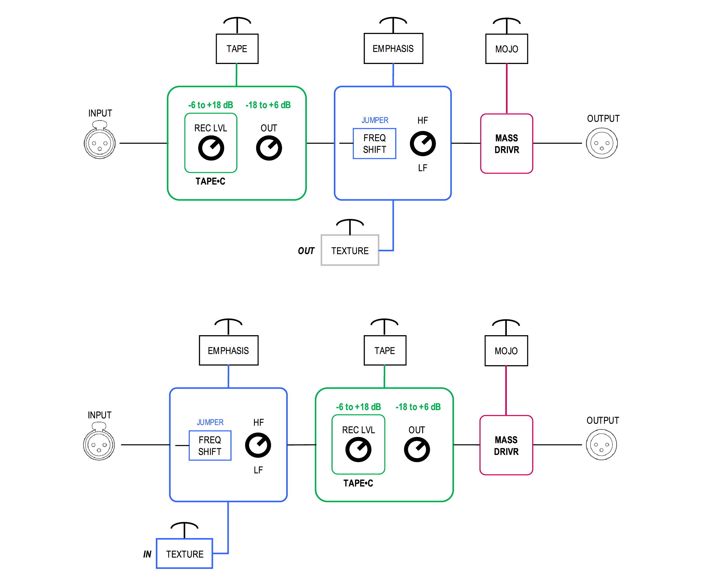 Erhöhen Sie die Bandsättigung, indem Sie die Eingangsverstärkung über den REC LVL- Regler erhöhen. Passen Sie den OUT- Regler an, um den Pegel zu steuern, der die MOJO -Bühne und das nächste Gerät in Ihrer Kette erreicht.