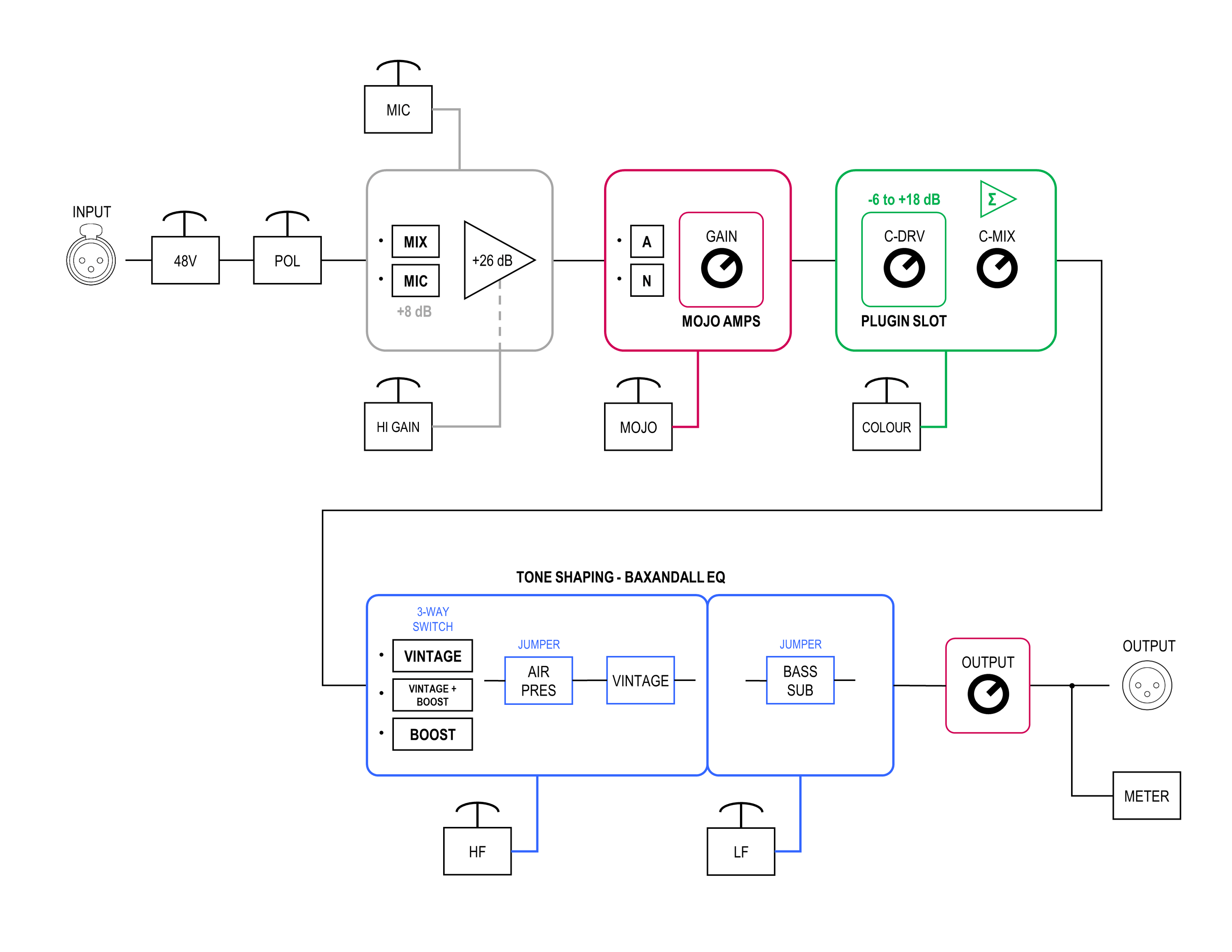 Wählen Sie Ihre Eingangsquelle – Mikrofon oder Mix. Wählen Sie A oder N MOJO. Wenden Sie eine wohlklingende Sättigung, Kompression, Filterung oder Klangformung an.