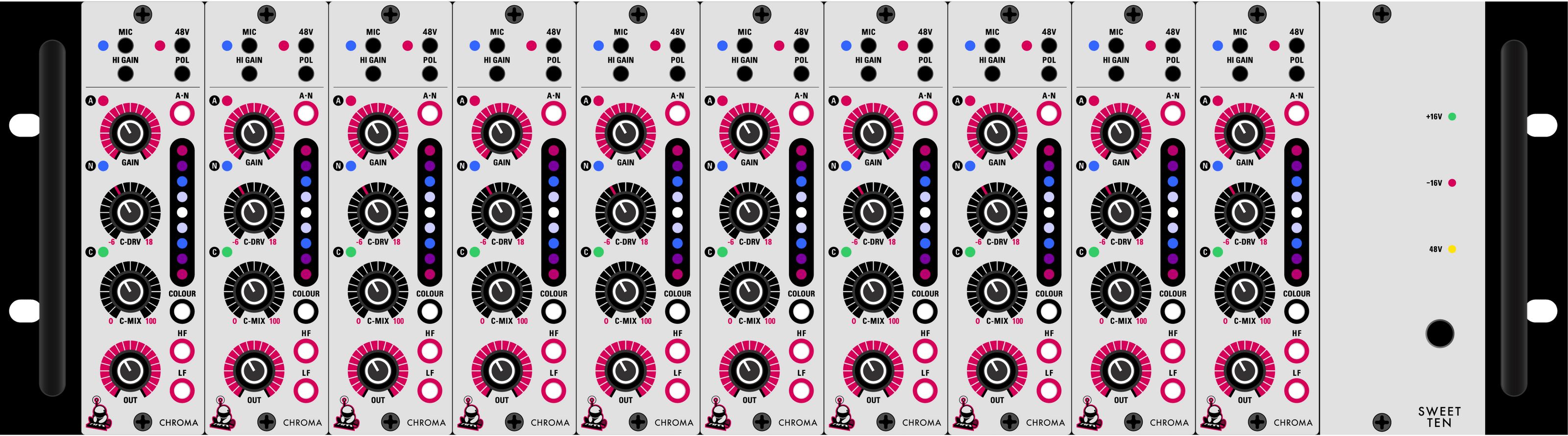 In Zusammenarbeit mit Purple Audio sind wir stolz, Chroma X mit einem LTL Edition Sweet Ten Rack betreiben zu können. Das Sweet Ten Rack und das Netzteil bieten hervorragende geräuscharme, gut geregelte Leistung in einem robust abgeschirmten Gehäuse und erfüllen gleichzeitig die transienten Anforderungen der aktuellsten, leistungshungrigsten Module auf dem Markt. Außerdem ist es robust gebaut und klingt fantastisch. Das LTL Edition Sweet Ten Rack ist ein Standard-Sweet-Ten-Rack mit 10 Steckplätzen, hergestellt und garantiert von Purple. Es verfügt über eine maßgeschneiderte Netzteil-Abdeckplatte an der Vorderseite in elegantem, de-branded Silber, passend zu den installierten Chroma-Modulen. Für alle mit einer Affinität zur dunklen Seite ist optional auch eine schwarze „Void Corp“-Platte enthalten, passend zum Finish Ihrer schwarzen Lieblingsausrüstung.
