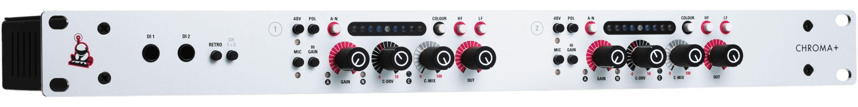 CHROMA+ ist ein äußerst anpassbarer Stereo-/Dual-Mono-Tracking- und Mixing-Kanal für moderne Hybridstudios, die mehr Ergebnisse auf weniger Raum erzielen möchten. Seine Twin-Tone-Amp- Architektur und sein Tone-Shaping-EQ basieren auf denselben Schaltkreisen, die im gefeierten Silver Bullet verwendet wurden. CHROMA+ kommt dem Ruf nach Flexibilität und Anpassung entgegen und bietet mit seiner Twin-Topologie ( A oder N ) einen Line-Prozessor und einen Mikrofon-/Instrumentenverstärker. Außerdem fügt es eine aufregende Besonderheit hinzu – einen analogen Plug-In-Steckplatz für Farbmodule . Diese Funktion ermöglicht die Einfügung integrierter Verarbeitungsfunktionen wie Röhrensättigung, Kompression oder EQ in den Signalpfad und die Mischung mit den klassischen, von „ A “ oder „ N “ inspirierten MOJO-Verstärkern von CHROMA+ für ultimative Vielseitigkeit im Front- und Backend, die von keinem anderen Produkt seiner Klasse erreicht wird. Es gibt sogar einen Mega-Mono-Modus zum Kaskadieren des gesamten Arsenals von CHROMA+ in einem 4-stufigen Kanalzug!