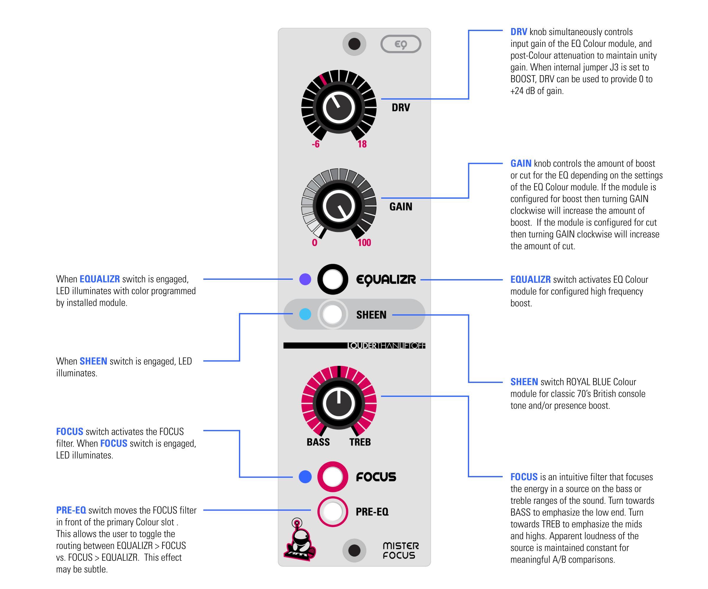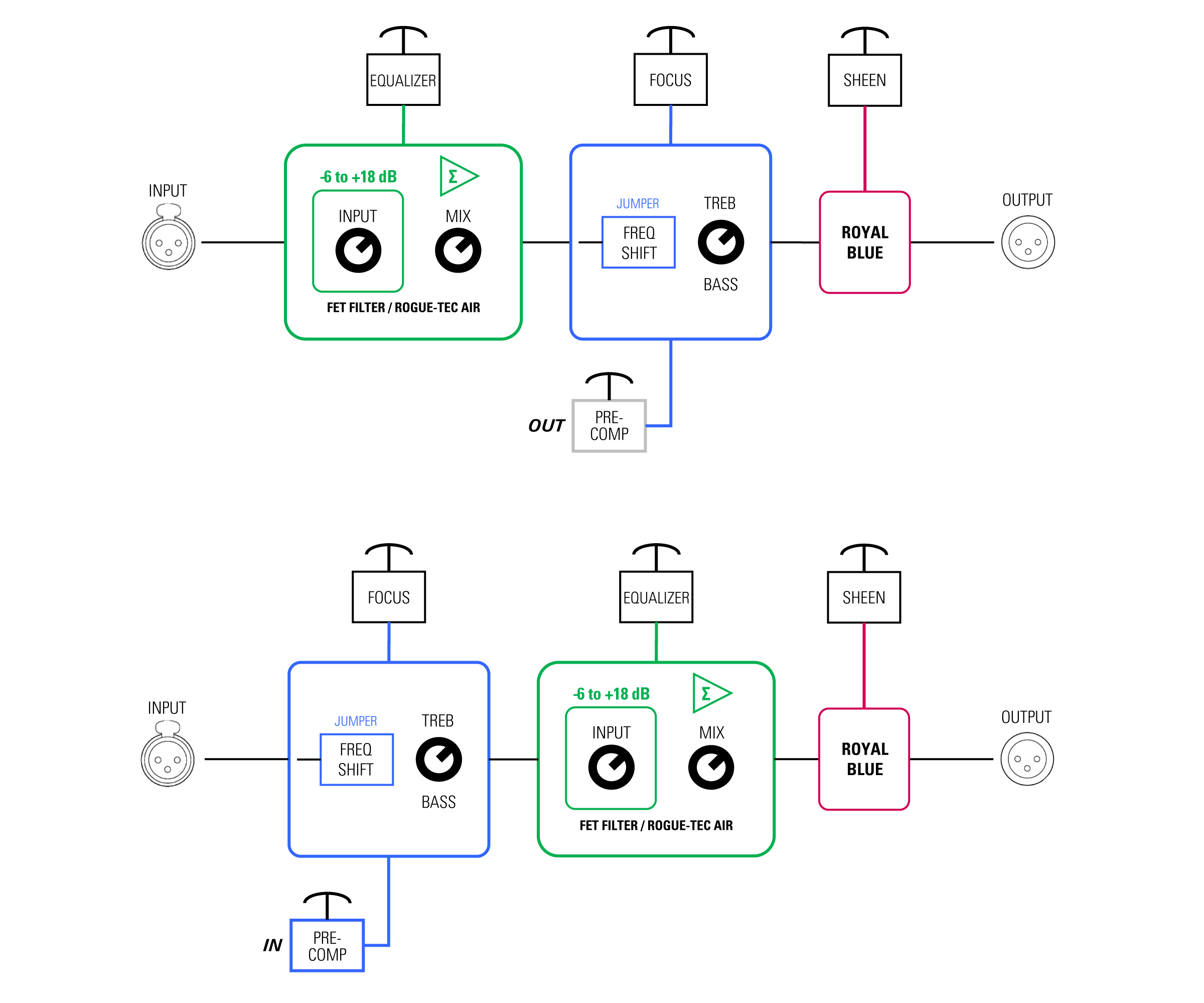 Mister Focus - EQ ist ein Equalizer, über den Sie nicht lange nachdenken müssen. Erhältlich in zwei Funktionsvarianten: passiver Pultec-Style High Shelf Boost (angetrieben von Rogue-Tec Air) oder FET-Sättigungs-EQ (angetrieben von FET Filter). Unser Ein-Knopf-FOCUS-EQ kann vor oder nach dieser Stufe platziert werden, um mühelos die Klangfarbe vor oder nach der Sättigung zu formen. Das finale Signal durchläuft die SHEEN-Stufe, die vom Royal Blue-Modul angetrieben wird. Diese verfügt über klassische britische Transistorverstärker mit einem reich klingenden Ausgangstransformator. Eine optionale Höhenanhebung kann per Jumper aktiviert und die gesamte SHEEN-Stufe ein- und ausgeschaltet werden.