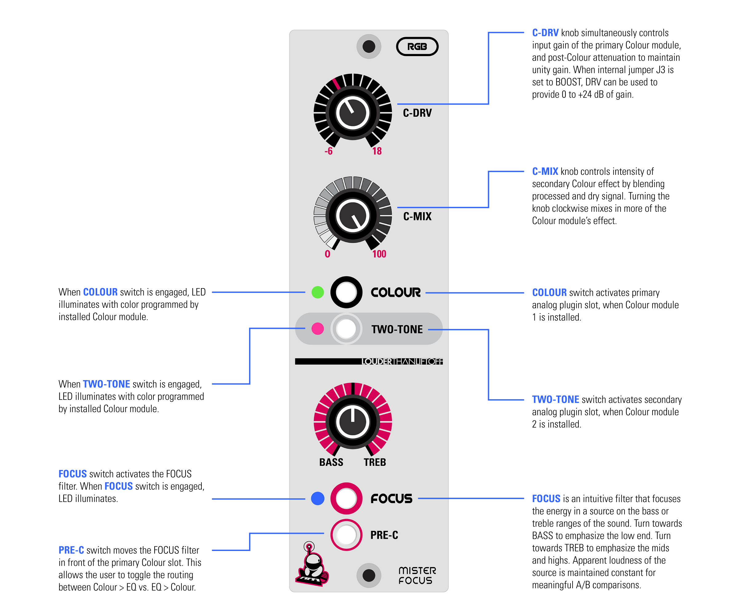 Die Colour-Plattform besteht aus Colours und Hosts wie Mister Focus oder Chroma. Colours sind ultrakompakte, austauschbare analoge Schaltungsblöcke, die in den Host einrasten und verschiedene analoge Klangfarben wie Verzerrung, Sättigung, Kompression, EQ und sogar Echo erzeugen. Das Host-Gerät bietet Ein- und Ausgangssteuerung, Stromversorgung und Unterstützungsschaltungen für die Colour-Module. Sowohl bei Mister Focus als auch bei Chroma lässt sich der Wet/Dry-Mix über den C-MIX-Regler steuern.