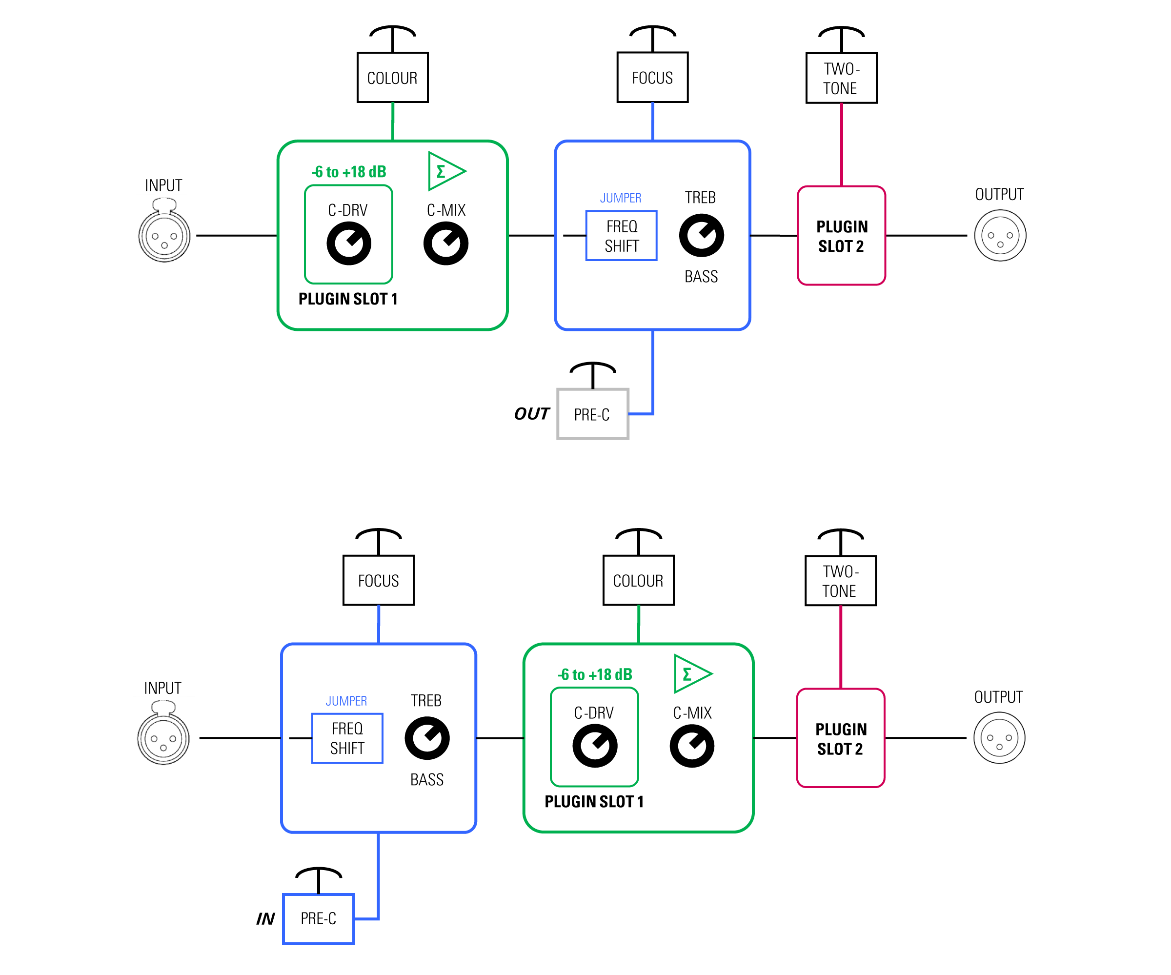 Mit dem PRE-C -Schalter kann FOCUS vor oder nach dem primären Farbsteckplatz platziert werden, um die größtmögliche klangliche Flexibilität zu erzielen.