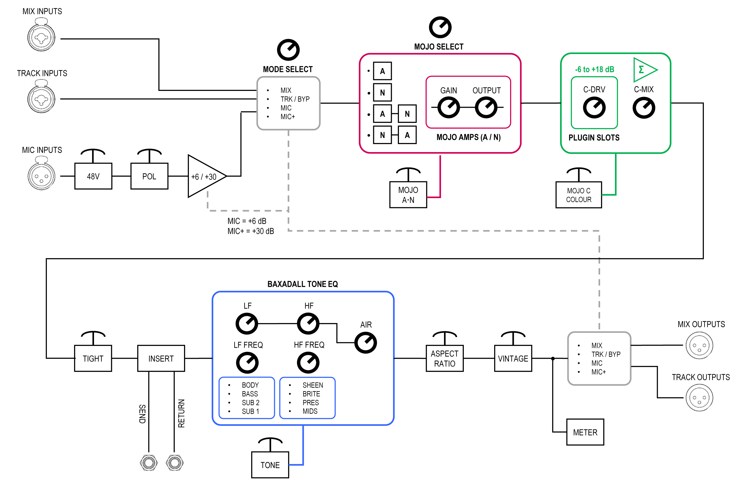 - 'A' and 'N' cascading MOJO Amp™ circuit topologies inspired by classic American and British consoles from the 70's